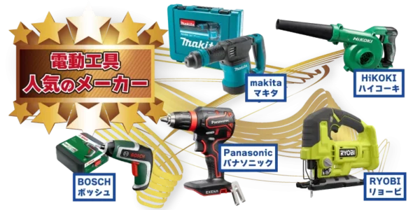 マキタ(Makita)・ハイコーキ(HiKOKI)・マックス(MAX)・パナソニック(Panasonic)・ボッシュ(BOSCH)など主要メーカーはもちろん、中古・未使用・動作未確認品すべて買取OK!